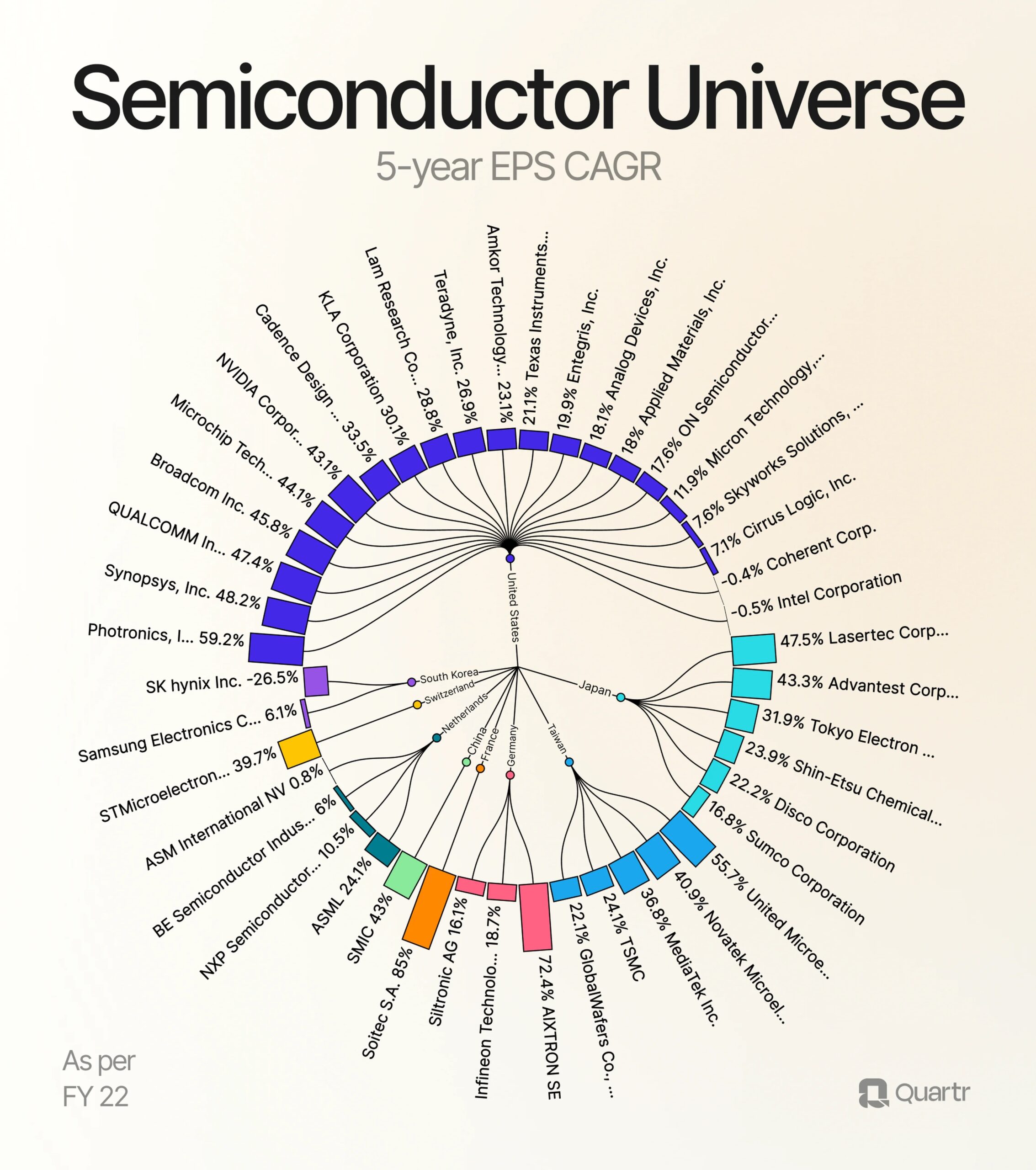 Nous aimons visualiser les choses, comme vous le savez probablement déjà. Cette infographie visualise les entreprises de l’industrie des semi-conducteurs et leurs TCAC BPA sur 5 ans.